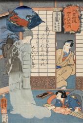 However, the part of the story seen in this print is steeped in pathos and tragedy. When the nobleman discovered his wife’s true identity, she had to return to the wild leaving behind only a poem. In this print, Abe no Semei is the child and Kuzunoha is the woman, seen writing the poem on a sliding door panel as she gradually transforms. Kuzunoha’s true form of a fox is revealed as her husband enters the room.