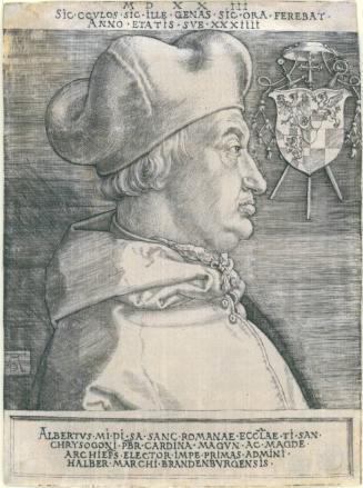 Not on viewCardinal Albrecht von Brandenburg (1490-1545) served as the subject of two portraits executed by Dürer during his later career. The first portrait was completed the year after Albrecht von Brandenburg received the title of Cardinal. Accordingly, the coat of arms at the top right of the print incorporates the tasseled hat typically worn by cardinals during the Renaissance. In another portrait executed four years later, the Cardinal is shown in full profile, above an inscribed tablet that bears resemblance to a memorial plaque.