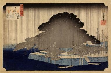 Not on viewAn image of a famous giant pine tree on the grounds of the Karasaki Shrine in Otsu. The straight, vertical lines suggesting the downpour of rain are cleverly paralleled by the posts used to support the extended limbs of the pine. The ink gradation technique called bokashi is used masterfully here, seen in the fade from black to grey in the tree, in the dark sky above, and in the water below. The printer had to apply this by hand to each color block. Hiroshige created over twenty versions of this series of eight prints titled Eight Views of Ōmi.