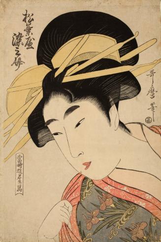 In this image of the famous courtesan Somenosuke, her name and the Matsubaya House are listed in the calligraphic inscription at the top. The cartouche at the lower left gives the title of the series, Contemporary Courtesans Drawn from Life (Tōji yūkun iki-utsushi), suggesting that these images were more “real” than others, bringing the viewer closer to these celebrated beauties. Sadly, only two prints from the series are known, this one and a portrait of another courtesan from the same house, named Yosooi. The number of prints in the original series is unknown.