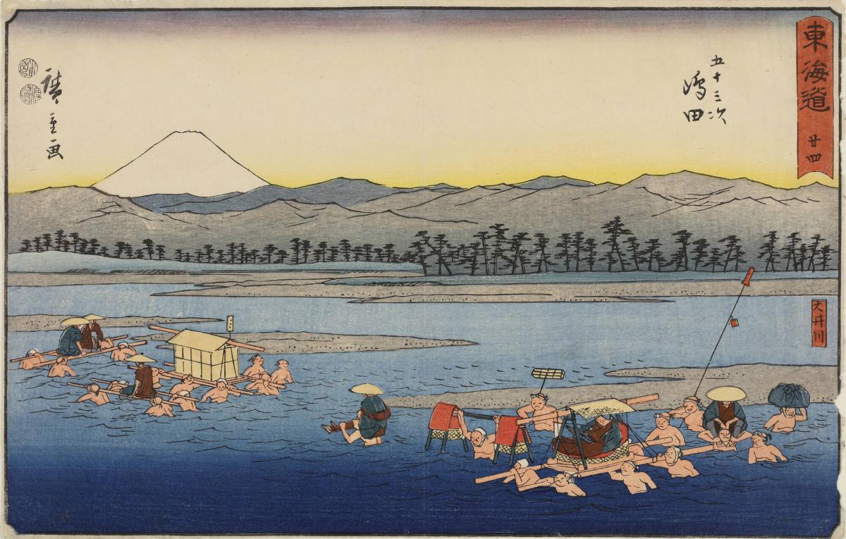 Fording the Oi River at Shimada, no. 24 from the series The Fifty-three Stations of the Tōkaidō, also called the Reisho Tōkaidō