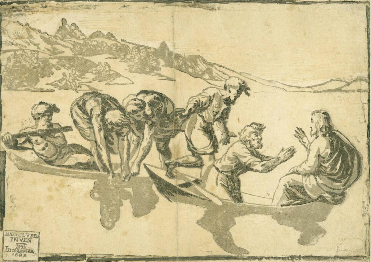 This print by Ugo da Carpi depicts the miraculous draught of fishes, as told in Luke 5. Although they had not caught any fish the night before, at Jesus' request his disciples placed their nets back into the water. To their surprise, the nets soon started to overflow with fish. In the aftermath of this miraculous occurrence, Peter bows down to Jesus, who sits at the far right.