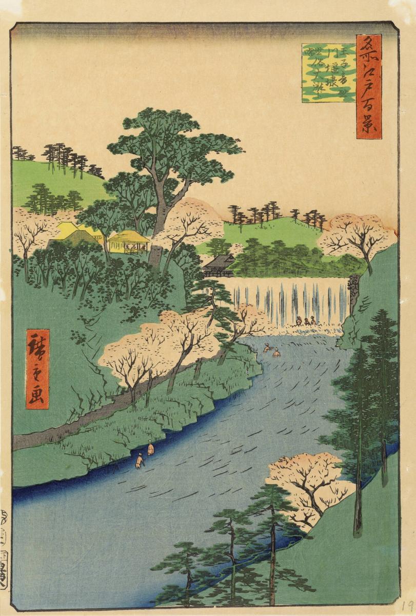 The Dam on the Otonashi River at Ōji, Popularly Known as "The Great Waterfall" (Ōji Otonashigawa entai, sezoku Ōtaki to tonau), from the series One Hundred Famous Views of Edo (Meisho Edo hyakkei)
