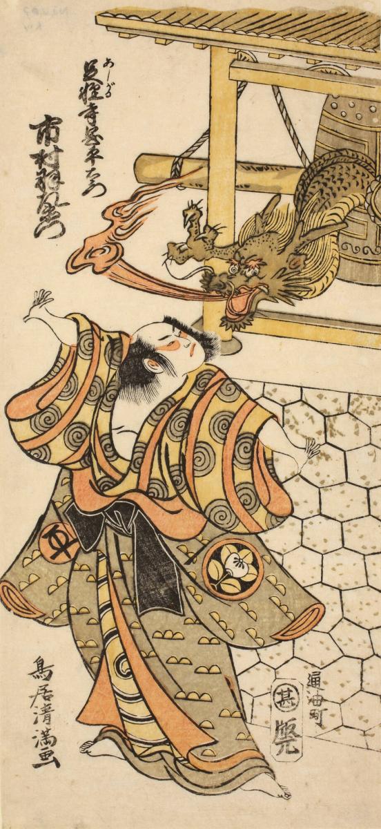 Not on viewAn actor strikes a dramatic pose, his hair wild and untied, as a dragon emerges from a temple bell behind him. The inscription identifies the figure as Teraoka Heiemon, a character in Chūshingura, or The Treasury of Loyal Retainers, the famous tale of the revenge of the forty-seven rōnin 浪人, or masterless samurai. Heiemon was the 47th rōnin. Because he was a low-ranking foot soldier, he was sent to report the success of their revenge back to their home domain. Due perhaps to his youth, he was the only member of the group who was not sentenced by the government to commit ritual suicide. There are many variations on his character and story in plays for kabuki and bunraku puppet theater.
