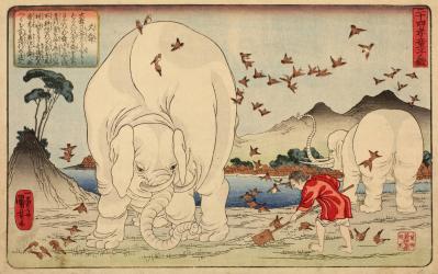 A direct example of Kuniyoshi’s study of Western sources, the elephants in this print appear to be based on an image in a Dutch book by Johan Nieuhoh (1618–1672), Gedenkwaerdige zee en lantreize door voornaemste landschappen van West en Oostindien, known in Japan as Tōzai kairiku kikō.