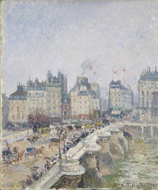 On viewIn 1900, Pissarro took an apartment at 28 Place Dauphine on the Ile de La Cité in Paris, from which he undertook an extensive series of paintings of the surrounding views along the Seine. Pissarro's vantage point offered a plunging perspective that accentuated the steep difference of levels between rooftops, bridge, boats, and the river. In this painting of the Pont Neuf, which links the Ile de la Cité to the right bank, the brushwork is looser and the colors more unified than in his earlier pointillist compositions. By eliminating certain whites and thinning his mineral oil medium with turpentine, Pissarro was able to achieve purer colors and at the same time heighten the transparency of the hues. The evenly cast haze saturates every part of the picture. Painted "wet on wet," the different colors dissolve into each other, creating a subtle fusion of the natural elements.