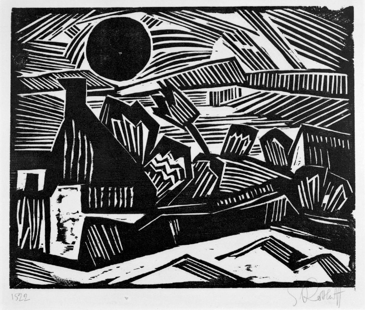 Not on viewSunrise over the Fiord depicts a visionary landscape, comprised of varied, abstracted shapes that define the hills and sky. Schmidt-Rottluff's mastery of the medium is demonstrated here, especially in the complex gradation of line to denote depth, perspective, and form. The importance of the artist's German heritage-evidenced by the addition of his native town, Rottluff, to his name-can be seen in this impassioned rendering of the small town of Flensburg. Located in the northern German state of Schleswig-Holstein, Flensburg is situated at the innermost tip of the Flensburg Fjord, an inlet of the Baltic Sea.