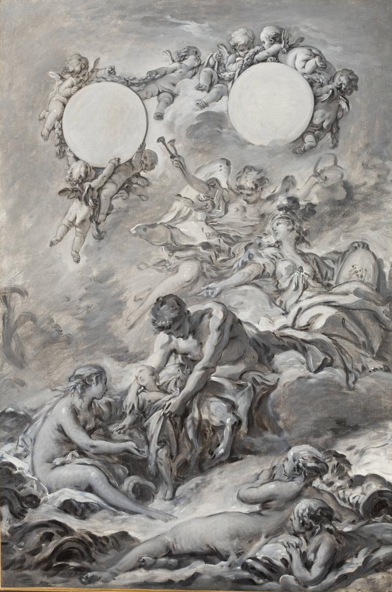 François Boucher holds an unparalleled place among eighteenth- century French artists; he excelled in painting, drawing, and printmaking, as well as tapestry and porcelain design, and was especially known for the freedom and virtuosity of his draftsmanship. The AMAM's work, executed when Boucher was at the height of his powers, bears witness to his talent in various media. It is a painting with the feel of a drawing, and was made in preparation for an etching that was to be just one of a series of prints conceived by the engraver Charles-Nicolas Cochin to depict medallions made in commemoration of important episodes in the life of the king (represented by the empty circles in the AMAM painting). With wonderful effects of light and tonal variety, the painting is at once historical, contemporary, literary, mythological, and allegorical, and depicts adults, children, female and male nudes, clothed figures, waves, and putti in an energetic zigzag composition-in short, many of the elements for which Boucher is celebrated.