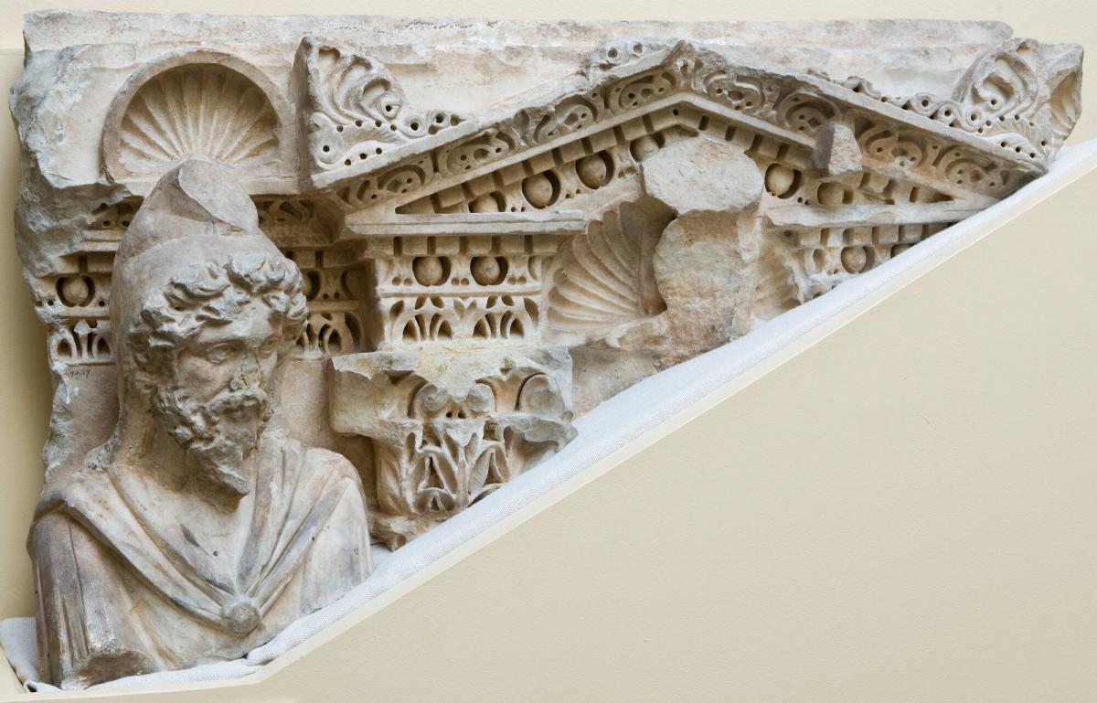 On viewThis sarcophagus fragment is thought to be Lydian in origin and was once considered as depicting the story of Odysseus due to the type of hat-a pileus-worn by the figure. More recently, however, the piece has been linked to Phrygian production and seen as possibly showing a Parthian prisoner. In any event, it does emanate from Asia Minor and is notable for including both a sculpted human figure and an architectural setting, and as an example of Roman imperial art in the Eastern provinces. The scalloped niche in the center under the pediment has a now-lost element (possibly a figure) before it, and the hint of a scalloped area to the right indicates that a figure would have flanked it on that side as well. Other decoration, including an elaborate cornice, Corinthian capital, and akroteria, make up the small templelike setting. Approximately fifty sarcophagi that conform to this general type are known, ranging in date from the second to the fifth centuries. The sculptor responsible for Oberlin's has made extensive use of the drill, creating a visually interesting interplay between light and shadow.