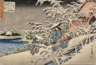 Tokiwa Gozen Flees with her Three Children in the Snow, no. 1 from the series A Pictorial Biography of Yoshitsune