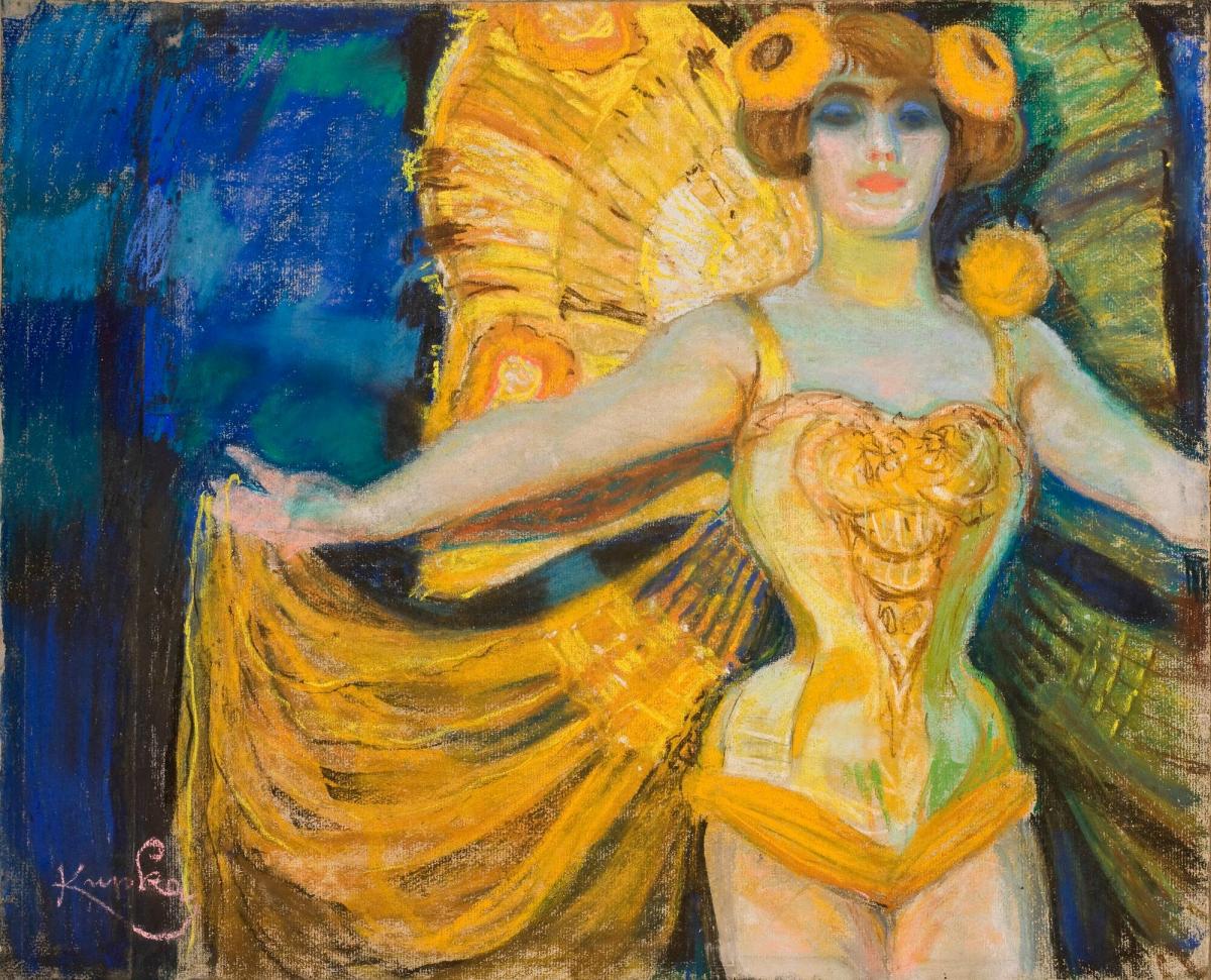 Not on viewThis vision of a showgirl is from František Kupka's early figurative period, when he was influenced by Symbolism and Art Nouveau. The dramatic lighting and brilliant costume seen here evoke the gas-lit stages and demi-monde glamour of café-concerts and other Parisian entertainment venues at the turn of the twentieth century. As a young artist in Prague and Vienna, Kupka was influenced by the religious art of the German Romantic painters known as the Nazarenes. Later, his interest in Symbolism led him to experiment with color theory and abstraction in painting, a style he maintained for the rest of his career.