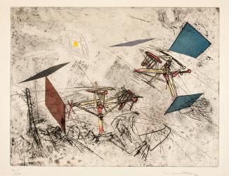 Not on viewMatta began to devote himself to print media during the late 1950s, mastering a number of complex color printmaking techniques. Many of these prints recall Matta’s painted “inscapes,” which seek to represent the interior space of the mind and juxtapose recognizable geometric shapes with more organic elements. The title of this series, Cosmicstrip, conveys the artist’s fondness for wordplay by wittily combining “comic strip,” suggestive of an animated narrative, with “cosmic,” an adjective often used to describe Matta’s vast universes.