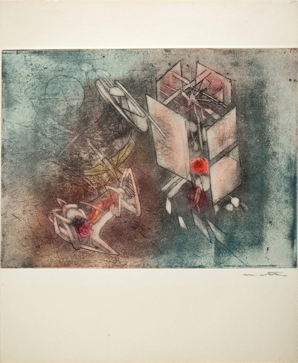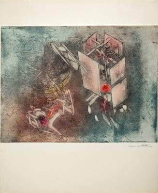 Not on viewMatta began to devote himself to print media during the late 1950s, mastering a number of complex color printmaking techniques. This work derives from the 1962 series Come detta dentro vo significado, whose title is taken from a line in canto XXIV of Dante’s Purgatory which roughly translates to “I am one who, when Love inspires him, takes note, and then, writes it in the way he dictates within.” This print recalls Matta’s painted “inscapes,” which seek to represent the interior space of the mind and juxtapose recognizable geometric shapes with more organic elements.