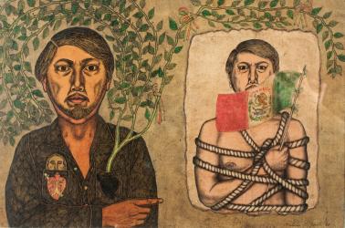 Not on viewIn the double self-portrait Viva Libertad, a figure at left wears a black, collared shirt with red, white, and green buttons, the colors of the Mexican flag. Over the chest pockets are mirror images of a pierced heart—one red and the other a black silhouette—a reference to the Catholic image of the Sacred Heart of Jesus and a symbol of Christ’s suffering. A miniature portrait peeks out of one pocket, while out of the other emerges a leafy plant—pierced with nails and decorated with red, white, and green ribbons—that encircles the artist’s head like a halo. The vine further extends to form a canopy over a second self-portrait, depicted on a trompe l’oeil scrap of paper, to which the black-clad figure also points with his finger. In this vignette, ropes bind the artist’s naked torso as he brandishes the Mexican flag, partially covering his face.