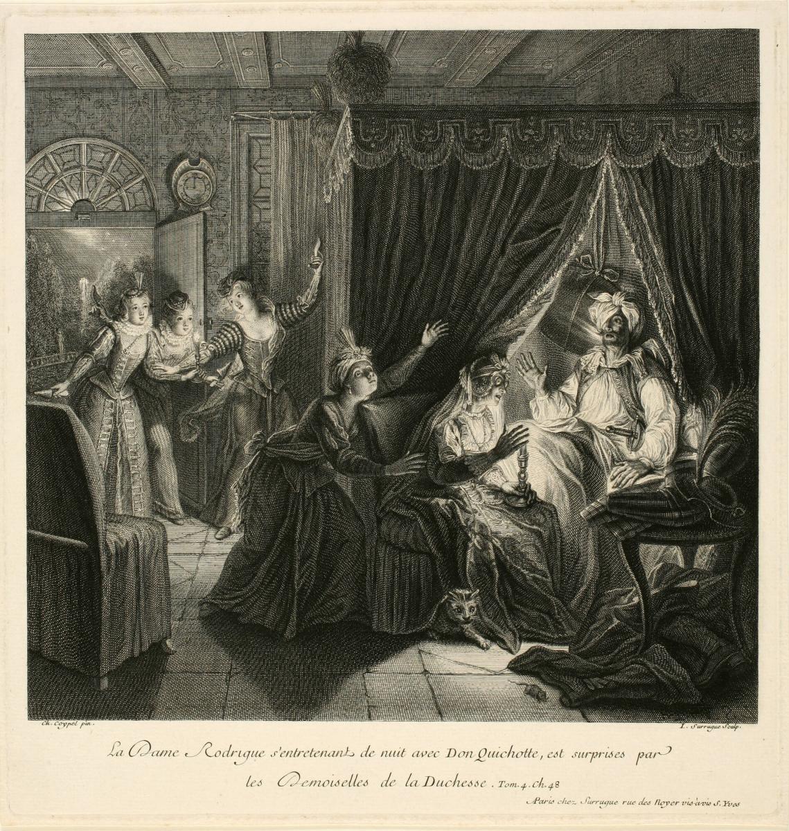 La Dame Rodrigue s'entretenant de nuit avec Don Quichotte, est surprise par les Demoiselles de la Duchesse
