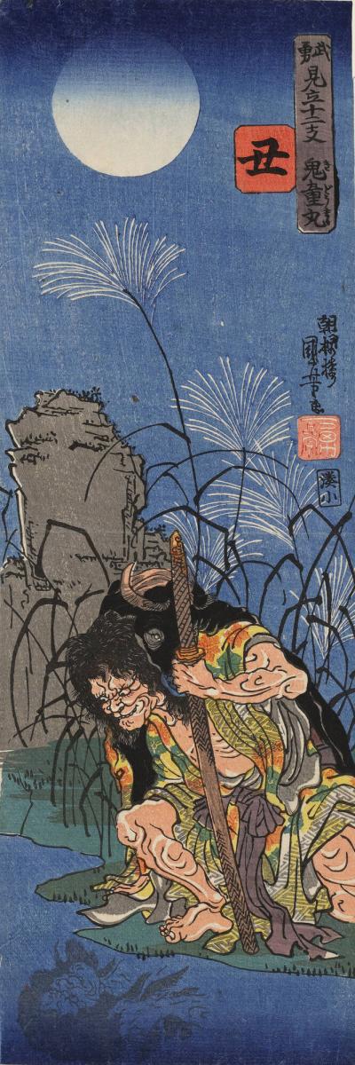Ox: The Outlaw Kidōmaru, Disguised with an Oxhide, Waits to Attack Raikō on His way to Mt. Kurama, no. 2 from the series Bravery Matched with the Twelve Animals of the Zodiac