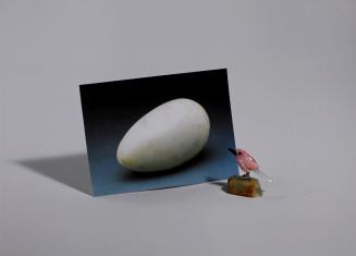 In her best known works, Liliana Porter composes still-life arrangements of small items such as toys, figurines, and other knickknacks. She monumentalizes these personally collected objects by isolating them within an empty background. The little toys, many of which possess an uncanny anthropomorphic quality, form witty juxtapositions with one another. In Brancusi, a bird gazes at an image of a marble egg, as though contemplating its own origins. Porter frequently incorporates reproductions of other artists’ works in her images, such as this postcard depicting Constantin Brancusi’s Sculpture for the Blind. The bird ornament further references Brancusi’s series of sleek Bird in Space sculptures, which the Romanian artist produced beginning in 1923. Porter’s playful reverence extends to other art historical figures for whom she has great respect, such as Belgian Surrealist René Magritte, whose treatment of objects as signifiers parallels Porter’s own approach to her inanimate subject matter.