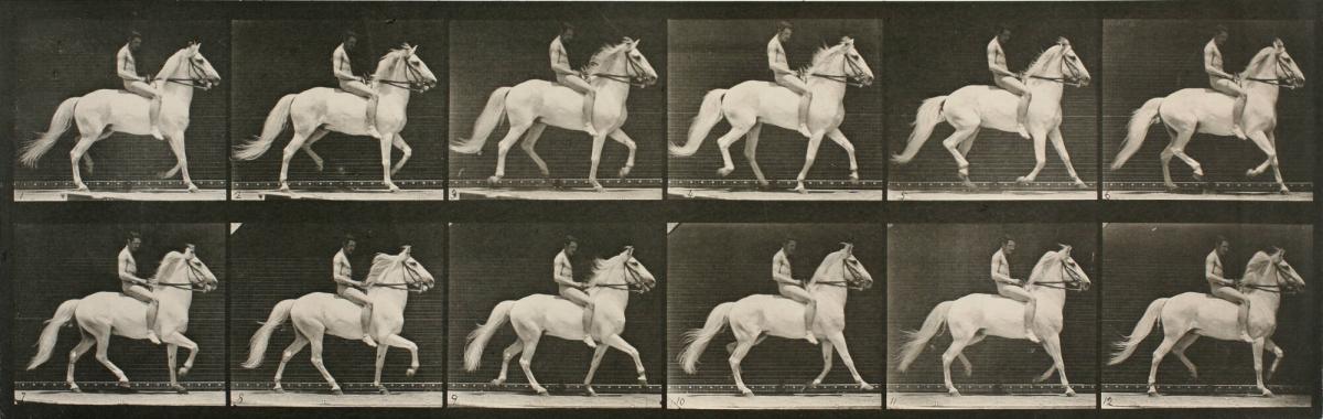 Best known for his photographic studies of humans and animals in motion, Muybridge was an accomplished landscape photographer and developed some of the earliest examples of motion pictures. In 1872, Muybridge was hired by Leland Stanford, then the governor of California and later the founder of Stanford University, to determine whether all of a horse’s feet left the ground simultaneously while running—a popularly debated topic at the time. Muybridge used a line of multiple glass-plate cameras with tripwires to study the effects of motion on humans and animals, creating an early form of stop-motion photography that produced images showing what the eye could not distinguish as separate. During the 1880s, he worked under the auspices of the University of Pennsylvania, analyzing locomotion and creating the photographic portfolio Animal Locomotion, which deeply influenced the fields of athletics, biomechanics, and the visual arts.