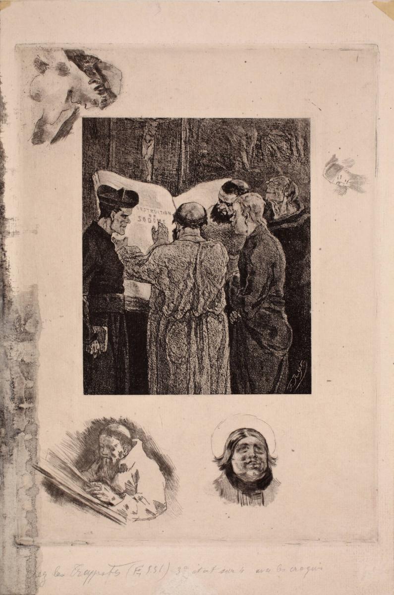 Rops was an inventive printmaker, often experimenting with different techniques and revisiting his printed imagery. In his later years, Rops used heliogravure, a photomechanical process, to transfer existing images to a copper plate, which he then reworked with an etching needle. The central image, a replication of his lithograph depicting Trappist monks previously published ca. 1865, is surrounded by additional etched figure studies. This impression is a proof that the artist pulled to check his progress; the line of spilled ink along the left side of the sheet indicates that this print is a work in progress.