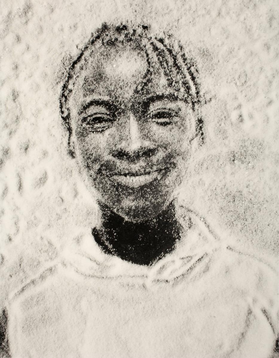 Valicia Bathes in Sunday Clothes stems from one of the artist’s earliest experiments with photographing transformed materials. For the Sugar Children series, Muniz worked from Polaroids to recreate the likeness of his subjects in sugar on a black background. The titles of the photographs reveal Muniz’s intimate relationship with the subjects, as they relate the name of each child as well as a personal detail about his or her life, such as Big James Sweats Buckets or Little Calist Can’t Swim. The children come from families who work in sugar cane plantations on the Caribbean island of Saint Kitts. Muniz chose to fabricate his Sugar Children from the very commodity they labor to produce: