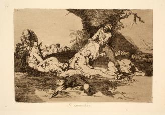 During these tumultuous years, Goya began producing compact etchings depicting scenes of war and its consequences. While several of these prints take on the character of an eyewitness report, they are not simply documentary accounts of the French occupation. Instead, Goya moves from the specific to the universal to uncover the essence of war, from acts of bravery to scenes of brutality, hunger, misery, destruction, and death.