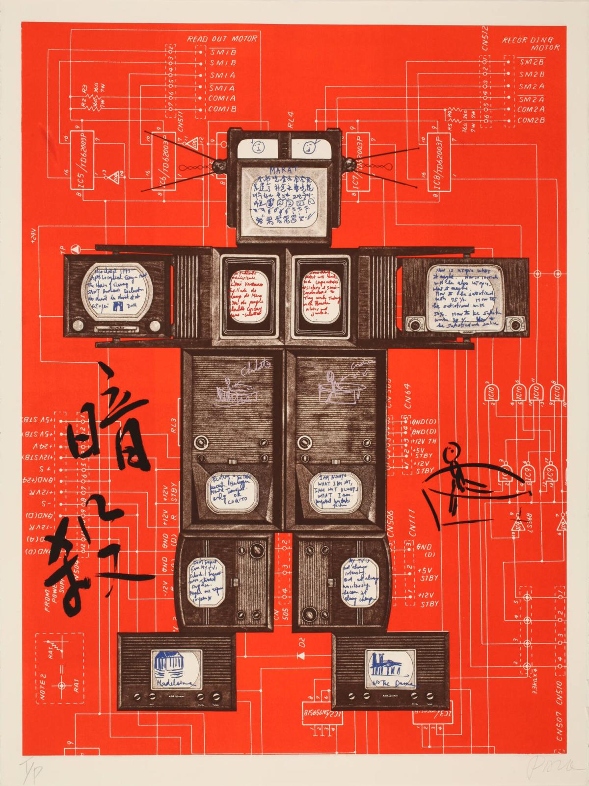 For the 1989 bicentennial of the French Revolution, the Museum of Modern Art in Paris commissioned Paik to create a series inspired by revolutionary leaders, their lives encapsulated within the artist’s signature robots. This print references Jean-Paul Marat (1743–1793), each screen a set of Paik’s multilingual thoughts and associations with the radical thinker’s writings, life, and death. Prominent at the left are the Chinese characters for “assassination” (ànshā 暗殺), and on the right and center are sketches based on Jacques-Louis David’s iconic painting of Marat dead in his bathtub, La Mort de Marat (The Death of Marat).