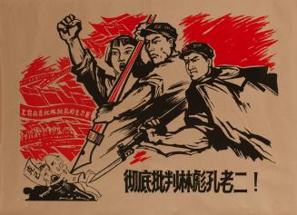 This poster engages the past on a number of levels. The rough style of the lines and simple color scheme recall early Communist posters of the 1930s made by the Modern Woodcut Movement. The imagery, typical of the era, shows a heroic soldier, worker, and student against a backdrop of a public rally. The trio symbolically attack Lín Biāo and Confucius, associating Lín with discredited traditional thought and culture as represented by the ancient philosopher. A clever dig at Confucius is also seen in the Chinese text that refers to Confucius as Kǒng lǎo èr 孔老二. This means “the second-eldest son of the Kong family,” which was true of Confucius, but, typical of the populist, earthy rhetoric of the Cultural Revolution, lao’er was also a Beijing slang term for penis.
