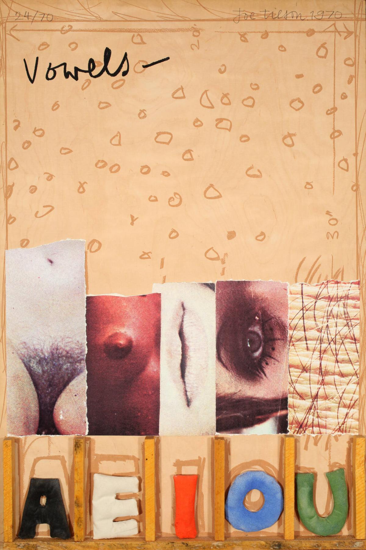 MediumSilkscreen, photographs, fabric letters, and wood panel