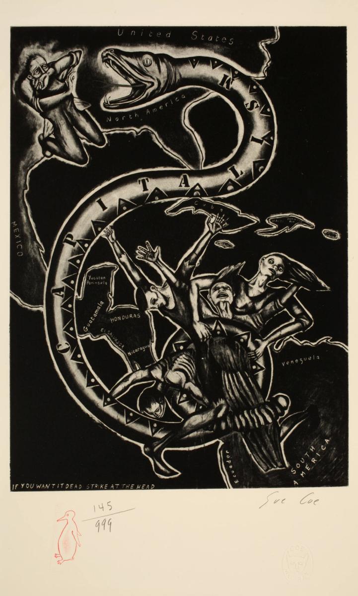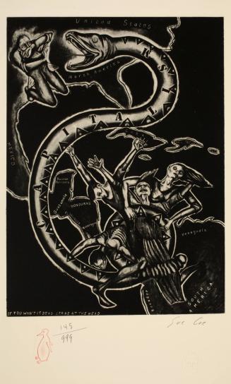 Not on viewSocial activism, marginalized peoples, and animal rights have for decades been themes in Sue Coe’s work, along with consumption, corruption, and—as here—capitalism. A snake’s writhing body holds people from Central and South America in its grip as its open, fanged mouth threatens a man poised over the region of Texas. The visual allure and richness of Coe’s densely composed imagery are subtly balanced with, and contrasted by, the repellent subjects she often treats.
