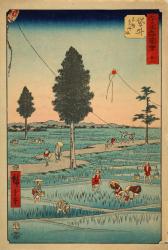 Fukuroi: Famous Tôtômi Kites (Fukuroi, meibutsu Enshû tako), no. 28 from the series Famous Sights of the Fifty-three Stations (Gojûsan tsugi meisho zue), also known as the vertical Tôkaidô