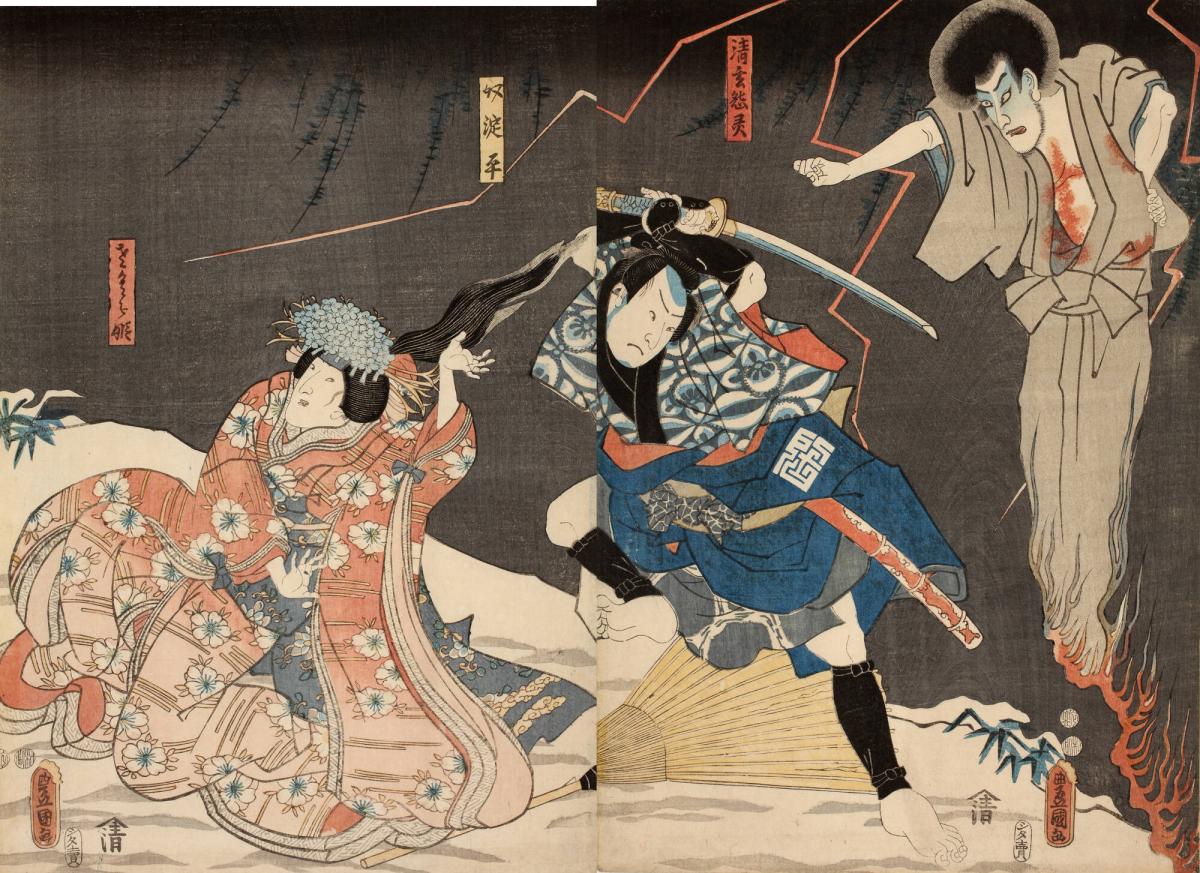 Actors Ichikawa Danjûrô VIII as the Ghost of Seigen (Seigen Onryô), Arashi Rikan III as the Servant (Yakko) Yodohei (R), and Iwai Kumesbarô III as Sakura-hime (L)