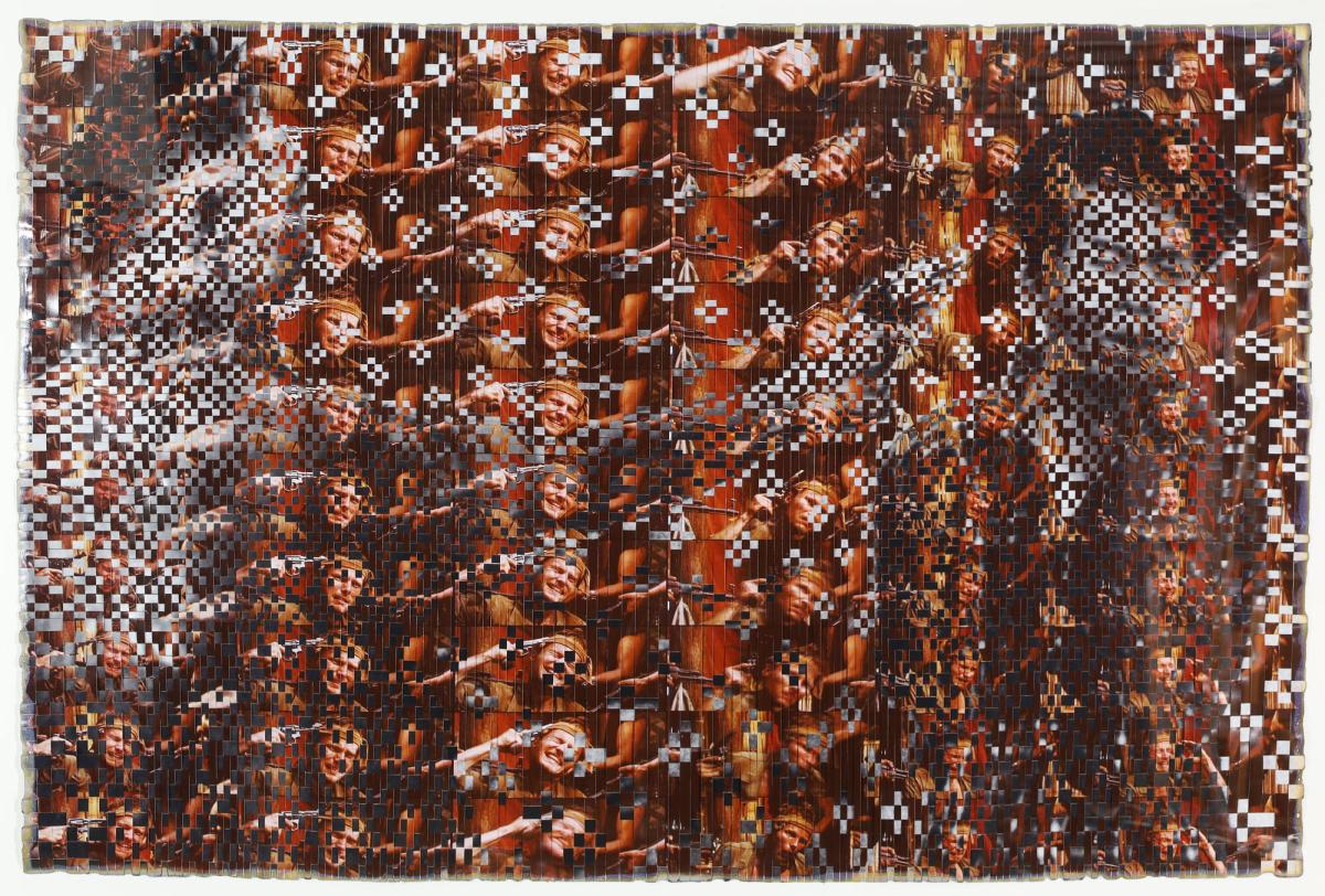 Russian Roulette presents a literal interweaving of Lê’s relationship to the legacy of the Vietnam War, arising from memory, history, and popular culture. The brutal reality of the war is reflected in Eddie Adams’s Pulitzer Prize-winning photograph of a South Vietnamese police chief executing a Viet Cong insurgent on a Saigon street, which acts as a large backdrop. Woven into it are frames from a scene in Michael Cimino’s film The Deer Hunter, in which an American soldier, captured by the Viet Cong, is forced to play Russian roulette.