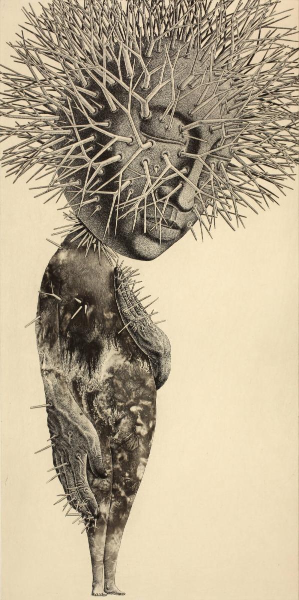 Branching twigs or thorns seem to burst out of a human form whose body evokes a landscape of complex, geological features. Tomiyuki Sakuta, whose recent prints are often of figures, has said that all his works are self-portraits, reflecting his obsession with negative feelings.