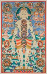 Not on viewA large human figure stands on a colorful lotus blossom, facing us against a background of mountains, sky, and clouds. Numerous small images of Tibetan Buddhist deities populate the landscape and float in the sky. Images of deities are also seen within the body of the figure. They appear in the face, in the legs and feet, and many are arranged in the petals and interior of symbolic lotus blossoms that line the figure’s central axis.