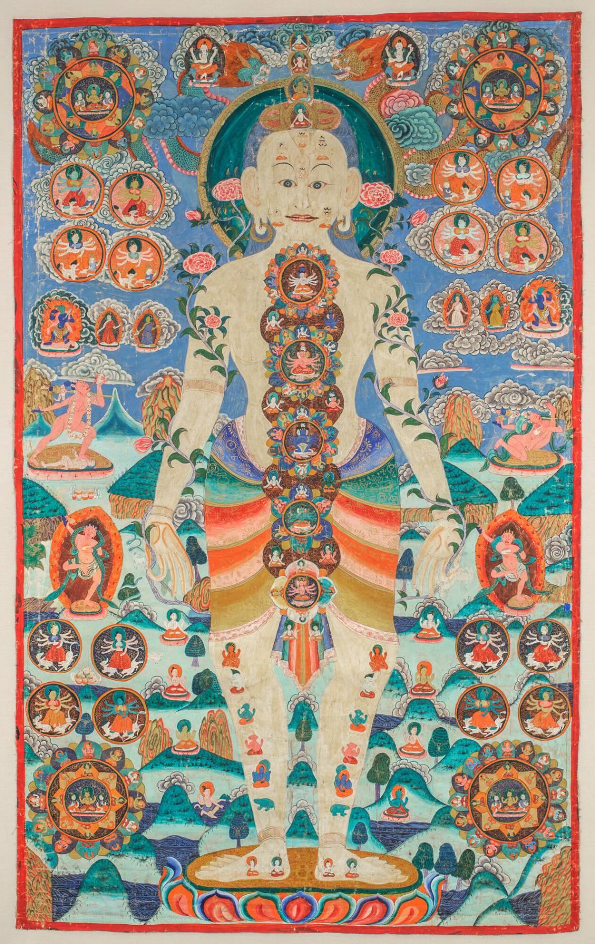 This vision of the interior of a human body derives from the Himalayan tradition of “body mandalas.” These complex paintings map a spiritual cosmos onto the human body, and are found in Hinduism, the indigenous Tibetan religion, Bön, and, like this one, in Tibetan Buddhism. In forms of advanced Tibetan Buddhist meditation, practitioners use visualization to transform their bodies into a dwelling space for deities and envision themselves as enlightened buddhas.