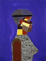 Not on viewDerrick Adams works across mediums, often engaging the space between figuration and abstraction. He cites Romare Bearden as a major influence, though his paintings and prints nod equally to Mickalene Thomas’s richly textured collages and to the flat planes of early 20th-century Cubism. This diptych (which includes "Man in Tidal Blue," 2017.45.2) borrows from the constructed aesthetic of collage, pitting fields of hand-painted, modulated blue against blocks of texture and pattern, including wood grain and army camouflage, which recur throughout Adams’s oeuvre. The format of this work derives from Renaissance double portraiture, exemplified by Piero della Francesca’s portraits of the Duke and Duchess of Urbino. Adams de- and re-constructs this precedent in a striking manner, replacing della Francesca’s white nobility with anonymous black subjects, whose skin he renders in a range of tones, rejecting any generalized notion of blackness while alluding to the aesthetics of low-res digital images and blocky color-identification technology.