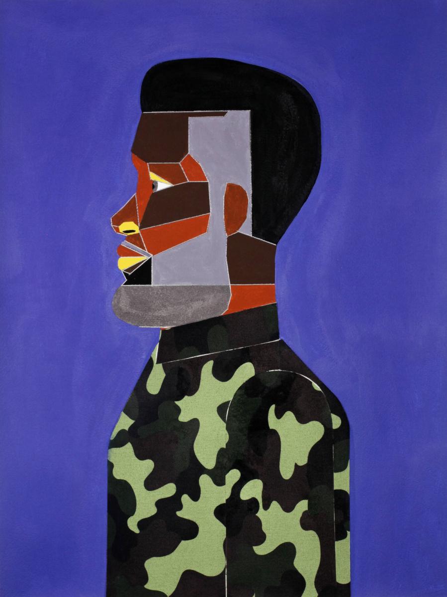 Not on viewDerrick Adams works across mediums, often engaging the space between figuration and abstraction. He cites Romare Bearden as a major influence, though his paintings and prints nod equally to Mickalene Thomas’s richly textured collages and to the flat planes of early 20th-century Cubism. This diptych (which includes Woman in Optimum Blue," 2017.45.1) borrows from the constructed aesthetic of collage, pitting fields of hand-painted, modulated blue against blocks of texture and pattern, including wood grain and army camouflage, which recur throughout Adams’s oeuvre. The format of this work derives from Renaissance double portraiture, exemplified by Piero della Francesca’s portraits of the Duke and Duchess of Urbino. Adams de- and re-constructs this precedent in a striking manner, replacing della Francesca’s white nobility with anonymous black subjects, whose skin he renders in a range of tones, rejecting any generalized notion of blackness while alluding to the aesthetics of low-res digital images and blocky color-identification technology.
