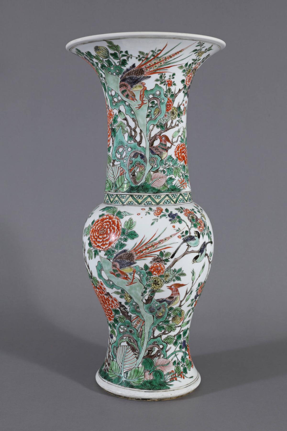 Famille Verte Beaker Decorated with Auspicious Birds, Flowers, and Garden Rocks