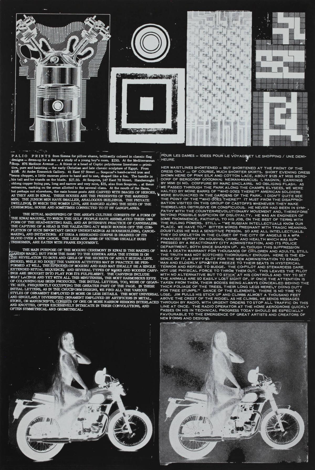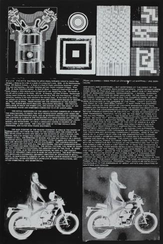 Not on viewEduardo Paolozzi, a member of the Independent Group, was known for his Pop aesthetic that juxtaposed found images from science fiction and American pulp magazines. Moonstrips Empire News, a print series with no predetermined order, encourages viewers to arrange and rearrange the pages as active editors of the suite. General Dynamic F.U.N., the second volume, combines geometric abstraction, iconic emblems and computerized diagrams into a dizzying array of visual information reminiscent of the mass media.