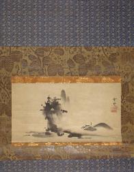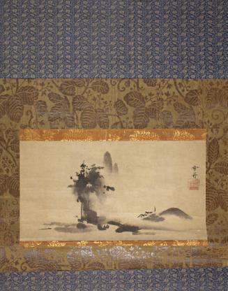 This landscape appears to show the Mountain Market in Clearing Mist theme from the Eight Views tradition, which reached Japan by the 13th century through Japanese Buddhist monks studying in China. The piece uses the haboku 破墨, or “splashed ink,” style influenced by Sesshū Tōyō, employing varied brushstrokes and ink splashes to create an abstract yet recognizable landscape.