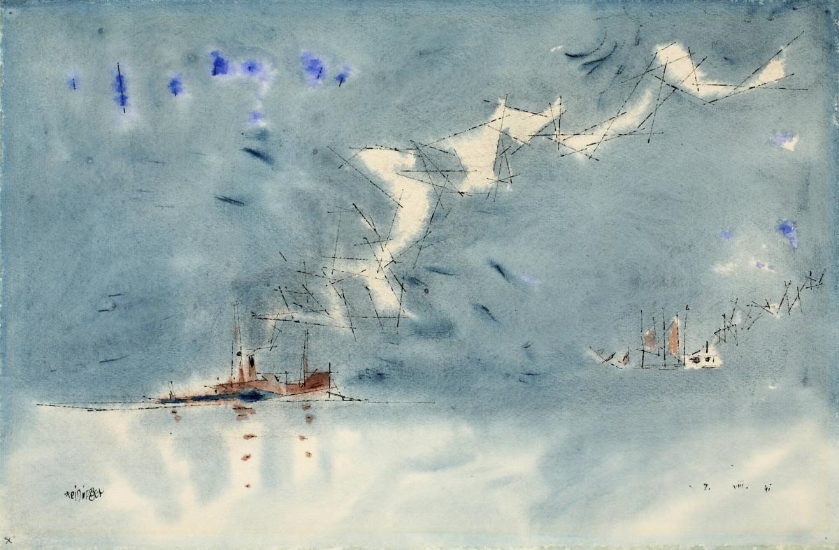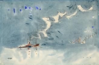 Not on viewTwo ships float on a body of water as trails of abstracted, jagged steam rise from their smokestacks. Among Feininger’s favorite subjects were maritime scenes captured in his distinct style, blending Cubism and Expressionism. In this watercolor, you can see another of Feininger’s major influences: Futurism—here captured in the hard lines and intersecting forms of the trailing smoke. Inspired by the technological advances of the 20th century, Feininger’s depiction of steam and smoke cutting into a washed-out sky celebrates the novelty of invention rather than the looming effects of coal-fired engines.