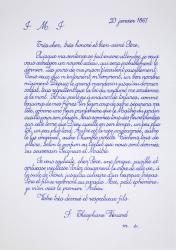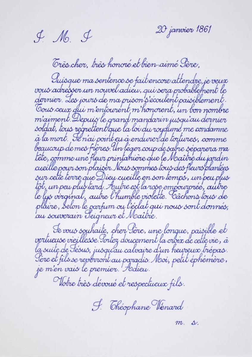 Not on viewVietnamese-born Danish artist Danh Vo is fascinated by deeply personal objects that intersect with larger histories of migration, displacement, assimilation, and belonging. For 2.2.1861, he asked his father, Phung Vo, to transcribe the last communication from the French Catholic missionary Théophane Vénard to his own father before Vénard was decapitated in 1861 in Vo’s native Vietnam. (His martyrdom was officially recognized by the church when he was canonized as a saint more than a century later, in 1988.) After copying the original French letter in his own exquisite handwriting, Phung Vo mailed it to the AMAM directly, transforming this conceptual work into a work of mail art.