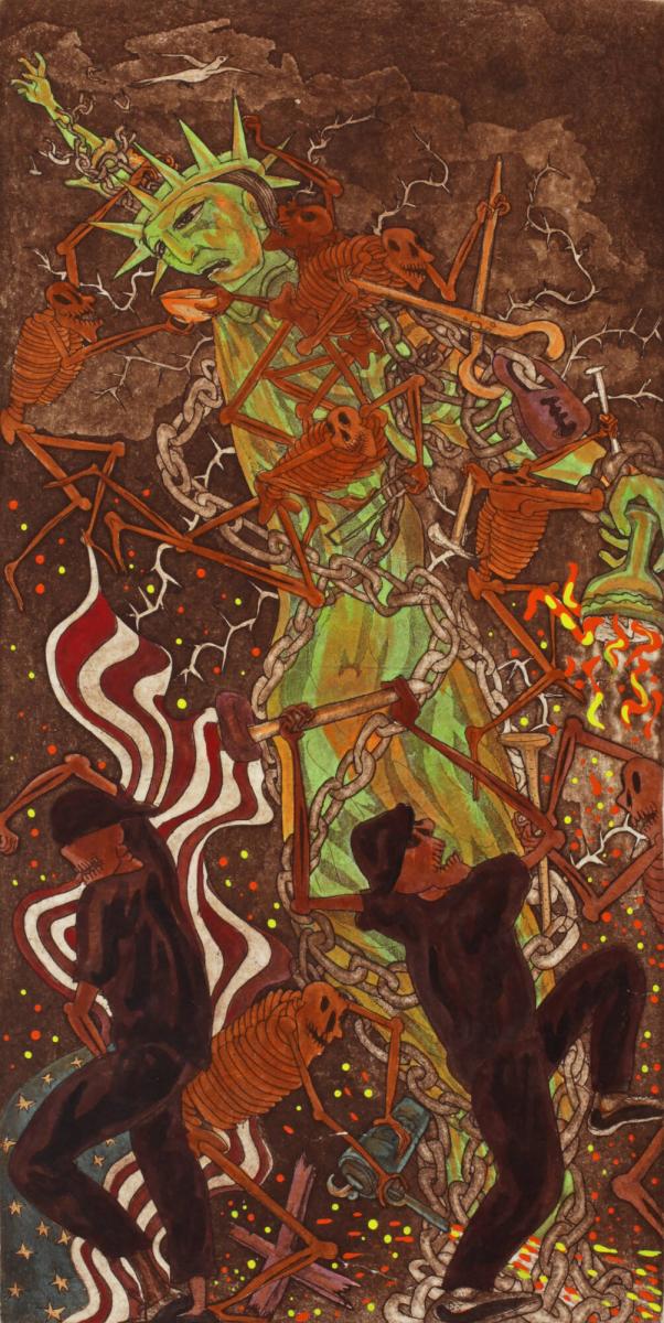 Not on viewThe graphic work of Nicolás de Jésus, a member of Mexico’s Indigenous Nahua community, often relates to themes of immigration, urban life, social injustice, and cultural identity. Here, in a work whose title translates as “Wake Up, America!,” the Statue of Liberty is enchained in darkness and under attack, with the American flag to the side. Yet a small ray of hope is present as a white bird, resembling a dove, flies above. As is evident here, the artist often works on traditional amate paper, made of bark.