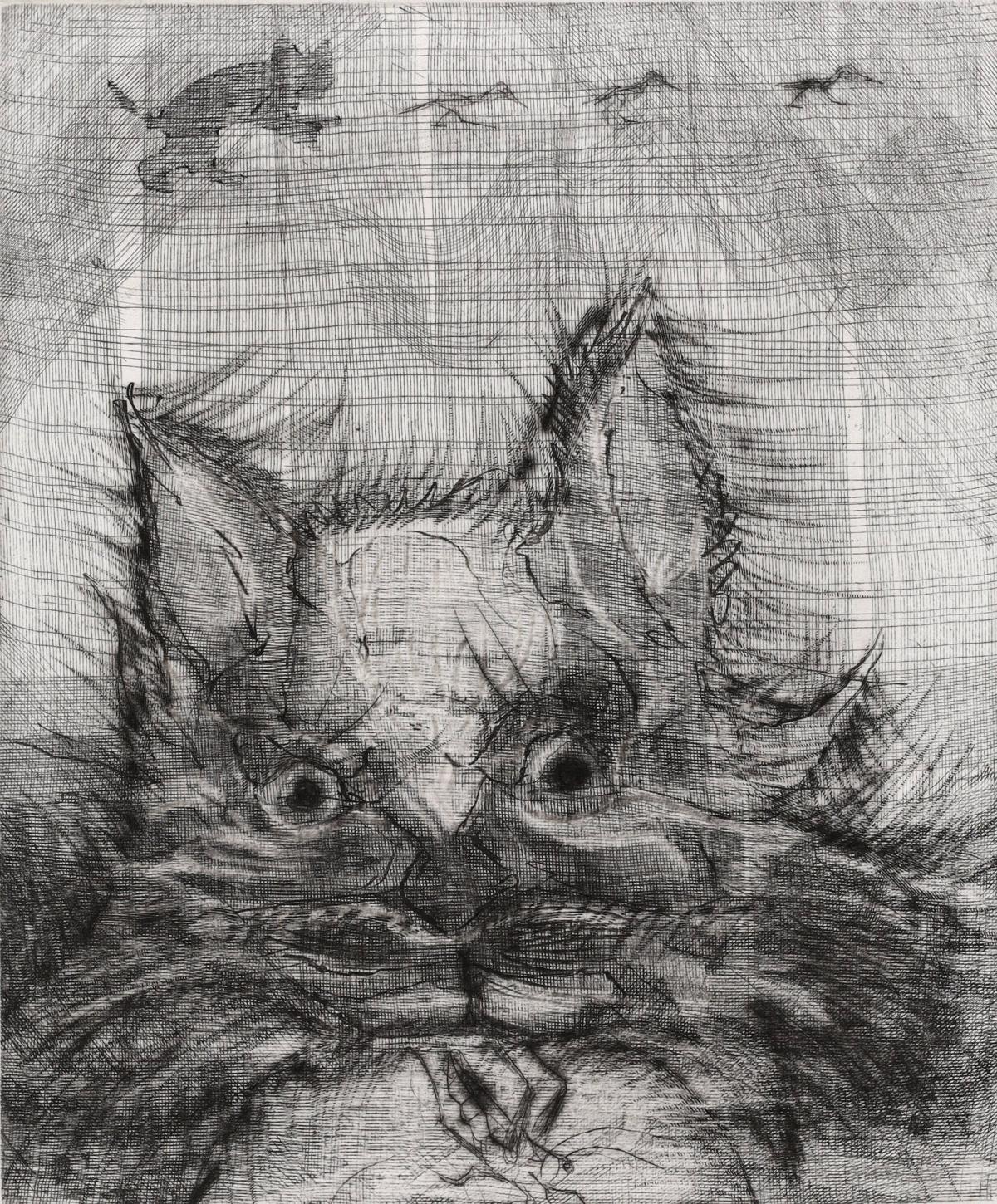 On viewThe career of artist and activist Francisco Toledo, of Zapotec origins (from the Indigenous community in Oaxaca), spanned seven decades. Animals and their activities were among his subjects, exemplified in this print that allows the viewer to come face-to-face with an inquisitive cat—surmounted by a charming vignette of one about to pounce on a line of birds.