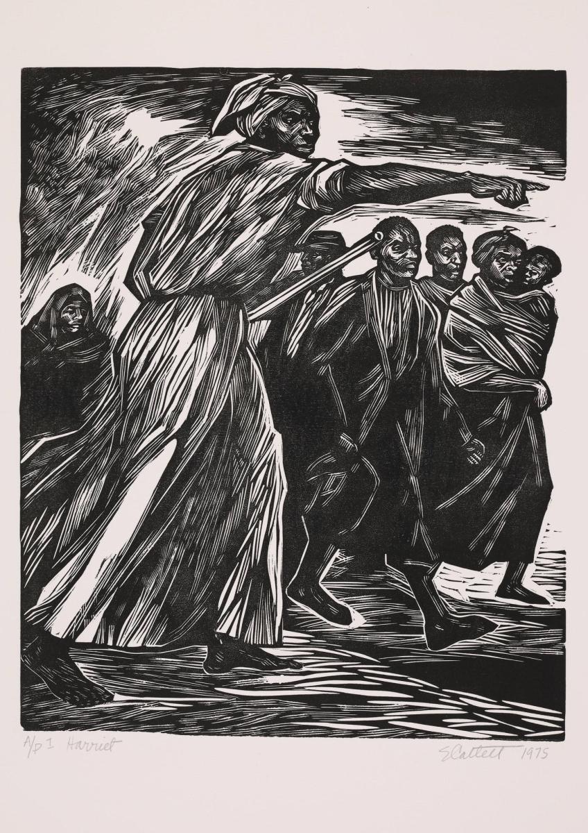 In this print, her courage, strength, and leadership as she conducts a group of people to freedom on the Underground Railroad are communicated by the forceful forward motion of her arm and stance, and her determined gaze. Elizabeth Catlett’s use of a low viewpoint and dramatic sky also impart to Tubman a monumental, heroic stature.