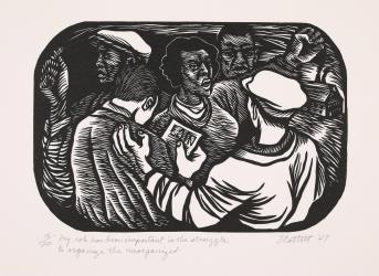Not on viewThis print is part of a series on Black women and the history of their oppression, accomplishments, and resilience. In this print, a Black woman with a powerfully raised arm speaks to men (one of whom holds a pamphlet that says “Join”), emphasizing the importance of Black women in the struggle for equality in labor relations. While making this series, Catlett was living and studying printmaking in Mexico City; murals there by artists such as Diego Rivera, also a staunch advocate of worker solidarity, were important inspirations for these works.