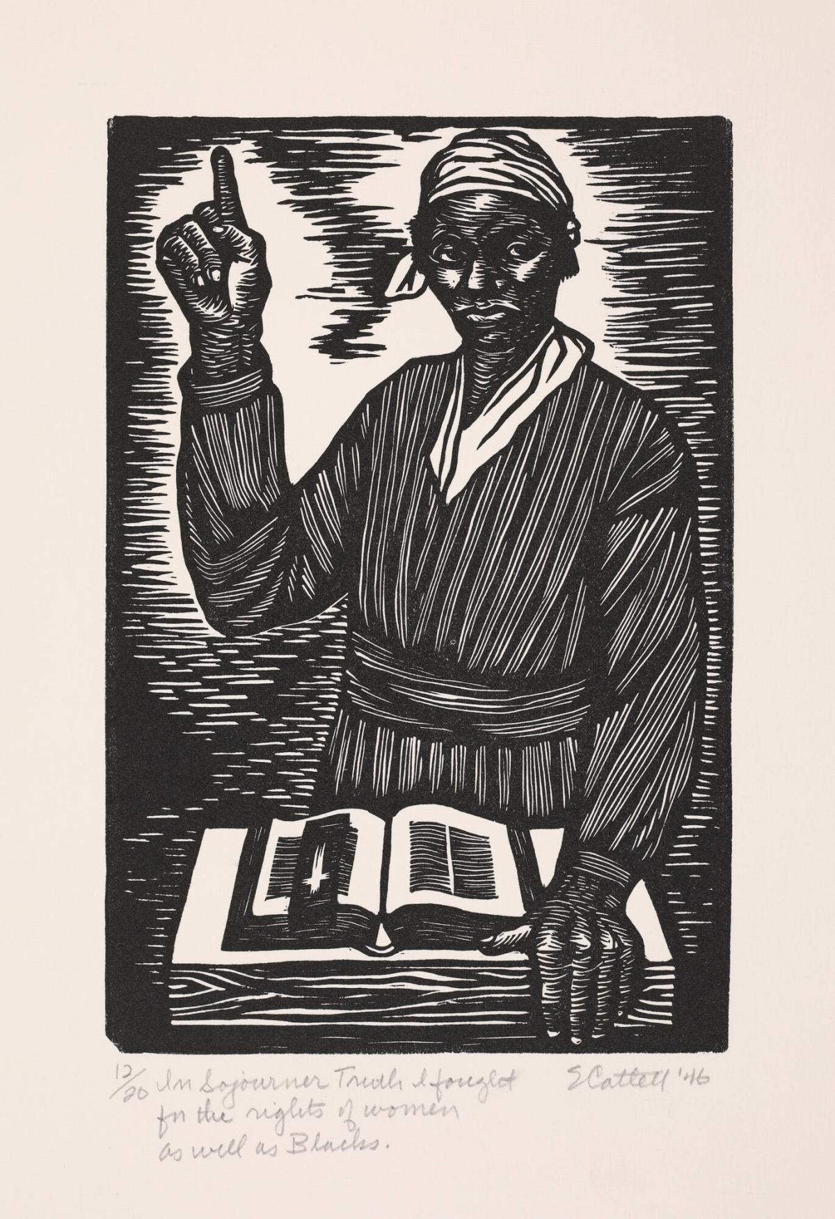 Elizabeth Catlett, an important Black artist, here depicts Sojourner Truth (ca. 1797–1883), the abolitionist and women’s rights activist. Born Isabella Baumtree, she gave herself the name Sojourner Truth upon becoming convinced that God had called her to go forth into the countryside to speak her truth to others. Born into slavery in New York state, she escaped to freedom in 1826. Two years later, she was one of the first Black women to go to court against a white man and win; Truth successfully sued to get her son back after he was sold to a man in Alabama by one of the men who had enslaved her. Truth dedicated her life to speaking out for a more equal society for Blacks and for women.