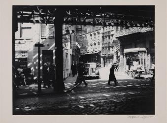 Not on viewBerenice Abbott, born in Springfield, Ohio, is known for evocative photographs of architecture and urban settings, as well as portraits. In 1935, the year of this photograph, she was hired by the Federal Art Project to supervise a series known as Changing New York. In this work, the dapples of brilliant sunshine filtering through the elevated railway’s tracks onto the cobblestone streets and brick façades help to create a dramatic, almost stage-like setting for what is otherwise a rather mundane slice of city life: residents going about their business.