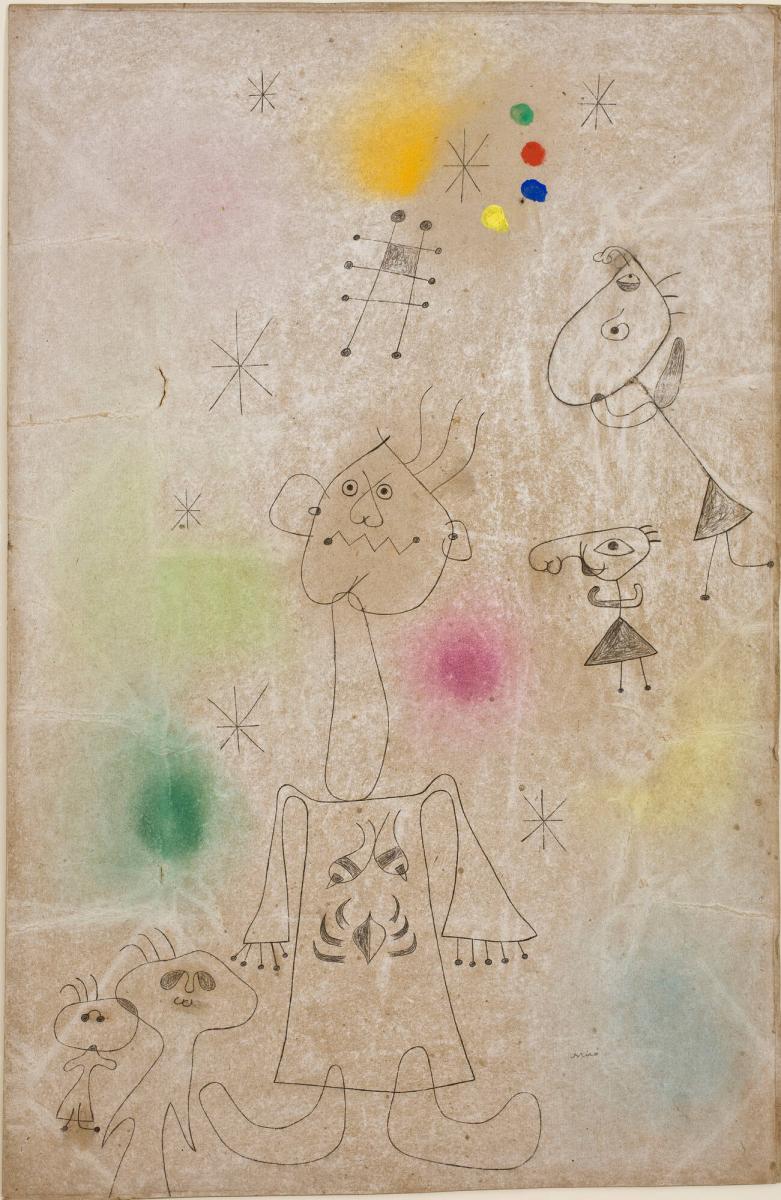 Not on viewBetween 1942 and 1944, during World War II when materials were scarce, Joan Miró worked solely on paper. This drawing, dated December 1, 1942, the artist prepared by rubbing pastel onto pulpboard in faint aureoles of color. This manner was reminiscent of his preparation of the earlier Constellations series of 1940 and 1941, which have crisply delineated biomorphic and cosmological forms in complex, all-over compositions. As he stated in his note-book, he wanted to “provoke accidents,” not “do pastels.” After rubbing pastel into the ground, he reacted to any “accidents” of its surface by carefully creating witty, dream-like drawings—here showing women, children, and an escape ladder, rendered in crayon.