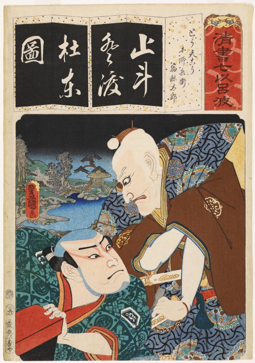 Actors: Nakamura Utaemon IV and Ichikawa Ebizo V as Hajibei and Sukune Taro, from the series The Seven Variations of the Iroha (or Book of 7 Alphabets)
